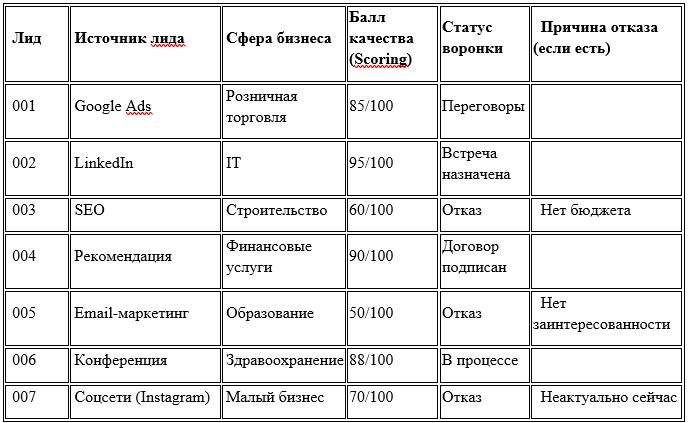 Причина отказа: Причина, по которой лид выбыл из воронки (если применимо).