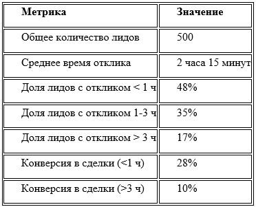 Применение: Оценка скорости реакции, что влияет на вероятность конверсии лидов в клиентов.