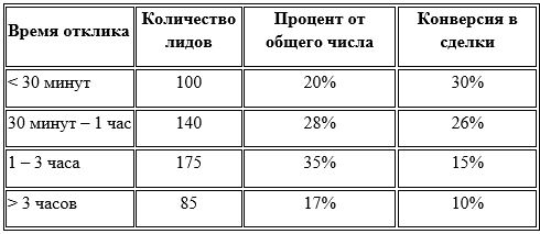 Этот отчет показывает, как скорость отклика влияет на конверсию, и помогает разработать стратегии для улучшения работы отдела продаж.