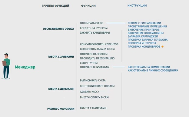 • Обязанности: указывает, что конкретно должен делать каждый сотрудник.