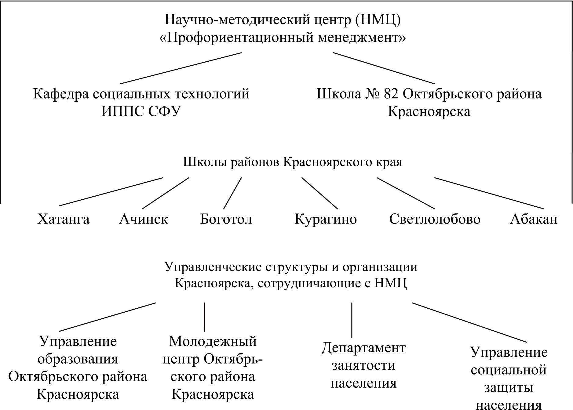 В результате многолетней работы кафедры с базовой школой № 82 Октябрьского района Красноярска был создан научно-методический комплекс «Профориентационный менеджмент», в структуру которого вошли кроме кафедры социальных технологий филиал СФУ в Усть-Илимске, средняя общеобразовательная школа № 82, лицей № 3, гимназия № 11 Красноярска, средняя школа № 1 с. Хатанги, средняя школа № 2 Усть-Абакана, средняя школа № 1 с. Курагино, средняя школа с. Светлолобово Новоселовского района Красноярского края, молодежный центр Октябрьского района Красноярска, кадровый центр администрации Красноярского края (рис. 1). По мере необходимости в состав научно-образовательного комплекса включаются другие образовательные учреждения.