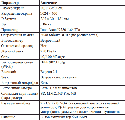Внимательное ознакомление с этой таблицей позволит нам ответить на вопрос, что собой представляет нетбук. Конструктивно его можно рассматривать как сверхбюджетный ноутбук, собранный в минимально возможном корпусе. Практически все сделано ради низкой стоимости: отсутствие оптического привода, недорогой экран, твердотельный накопитель или жесткий диск небольшой емкости, адаптер Wi-Fi и батарея, обеспечивающая 4–6 часов автономной работы. Несомненно, мощности таких устройств хватает для работы в Интернете и правки текстовых документов, но вряд ли нетбук обеспечит вас всем, что может предложить настольный ПК или хотя бы полноразмерный бюджетный ноутбук. Скорее, нетбук можно рассматривать как дополнение к обычному настольному компьютеру или даже полнофункциональному ноутбуку, используемое в условиях, когда существенно важна мобильность и компактность устройства.