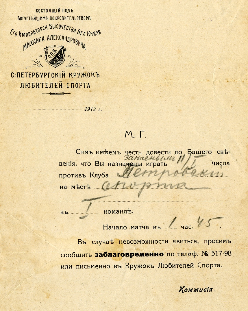 Играл я за «Спорт» в 1913, 1914 и в 1915 году. Кроме этого, почти всегда входил в состав сборной Санкт-Петербурга. К сожалению, Первая «империалистическая» война прервала мою петербургскую футбольную карьеру – в 1915 году я ушел на фронт.