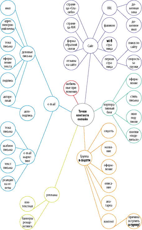 Мы с Надеждой сели и накидали основные точки контакта онлайн в программе MindNode (карты памяти), и вот что у нас получилось: