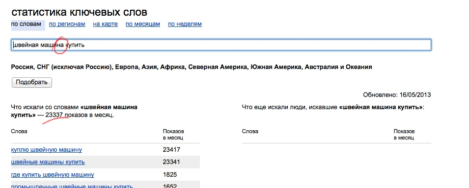 5. Поисковые запросы. Как-то раз моя коллега искала в своем любимом интернет-магазине швейную машинку. Не нашла. Она здраво рассудила, что такого не может быть, и стала искать в каталоге. Конечно, она нашла то, что нужно, но швейные машинки назывались там «швейные машины». А теперь посмотрите на скриншоты из статистики поисковых запросов на wordstat.yandex.ru.