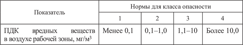 При этом класс опасности вредных веществ устанавливают в зависимости от норм и показателей, из которых наибольшее практическое значение для характеристики токсичности веществ представляют их предельно допустимым концентрациям (ПДК) в воздухе рабочей зоны (табл. 1.1).