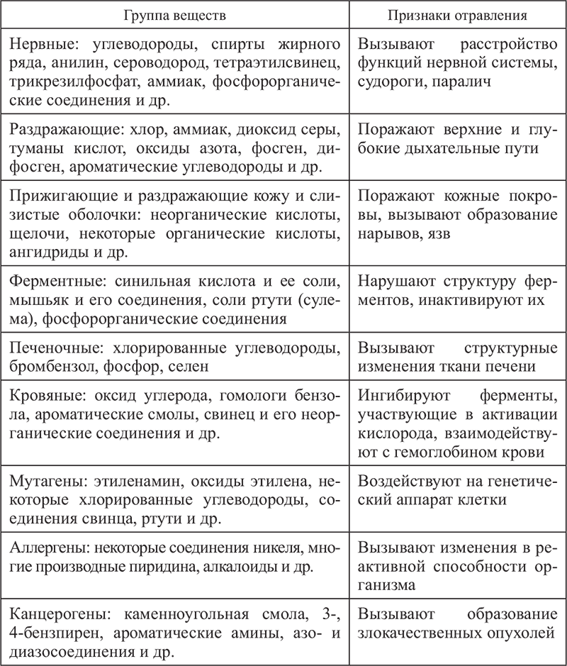Таблица 1.2. Классификация вредных веществ по характеру токсического действия на организм человека