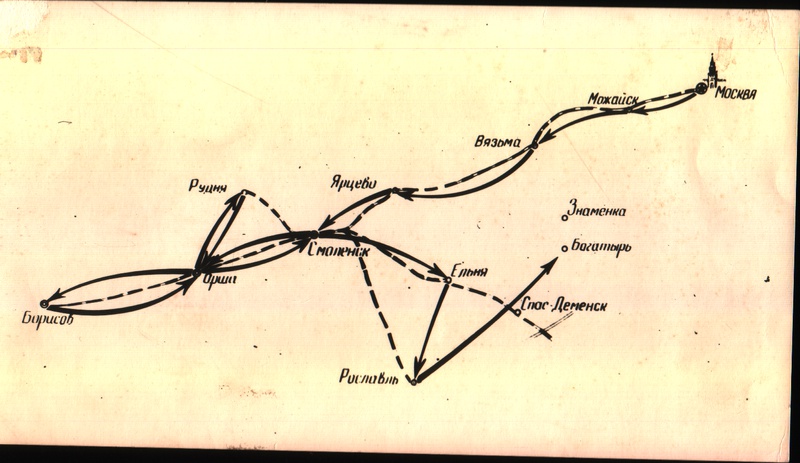 Схема движения батареи Флёрова из Москвы к Орше в июле 1941 года