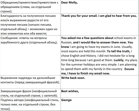* Сообщение или ответы на вопросы: в данной части используются вводные фразы (или «связки»), которые не являются обязательными элементами письма. Их можно опустить.