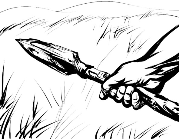 И вот тут произошла большая неприятность. Тэлэк, спускаясь со склона, случайно наступил на камень и подвернул ногу. Из-за этого он не мог второй раз бросать копья по трём мишеням. Для него это означало полный провал. Парень не мог пройти испытание и, следовательно, должен был расстаться с мечтой стать охотником в этом году, как и в прошлом. Такого позора он бы не пережил. Он хотел выхватить нож у одного из охотников, но тот вовремя среагировал и оттолкнул его.