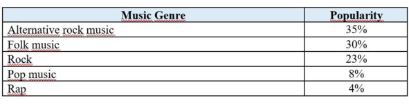 38.1 Imagine that you are doing a project on what music genres are popular among teens in Zetland. You have found some data on the subject – the results of a survey (see the table below).