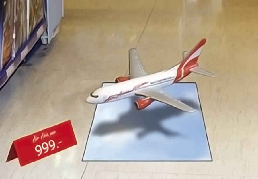 Если в месте аренды или ином месте обитания есть такая возможность, то почему бы ею не воспользоваться? Такой способ заявить о себе подойдет преимущественно для сферы торговли. Удобен он тем, что появляется шанс лишний раз напомнить о себе потребителю и обратить на себя его внимание. Не могу дать точную оценку эффективности напольной рекламы, но в торговых центрах, где есть несколько этажей или длинные коридоры, она явно может способствовать положительной тенденции продаж. Часто ее делают в виде стрелочек (указателей) или «следов», идущих друг за другом в определенном направлении. Хорошо, когда такая реклама имеет 3D эффект: это эффектно выглядит на общем фоне и заметно выделяется. В общем и целом, пример ниже: