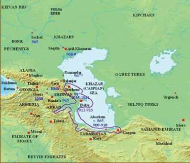 Кроме Черного моря русские с помощью свое- го флота активно пытались осваивать и Хвалынское (Каспийское) море и его побережье. Они на ладьях шли по рекам Днепр и Дон, затем перетаскивали их по сухому пути на реку Волга и спускались потом в Каспийское море. По свидетельству персидских историков, около 880 года русские приходили к их городу Абескуну, но были там истреблены. В 910 году на 16 судах они снова пришли к этому городу. А в 914 году несколько тысяч русских на 500 судах вышли с Волги и основали свой порт на одном из островов Каспийского моря, недалеко от Баку, от куда они делали набеги на западный и южный берега Каспийского моря. В 944 году было еще одно значительное нападение русских на побережье Каспийского моря. Около 1175 года они вновь опустошили некоторые места на южном и западном берегах. Но их флот (72 судна) был разбит персами.