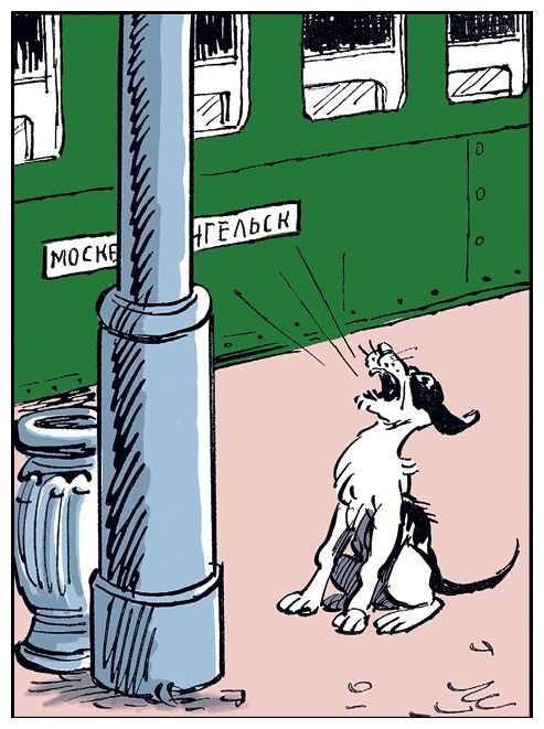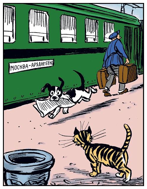 – Здравствуйте! – поздоровался с Петей проводник скорого поезда Москва – Архангельск. – С билетом всё у вас в полном порядке. Но вот собачки-то – без намордников! Так нельзя в поезде ехать… Нужны намордники.