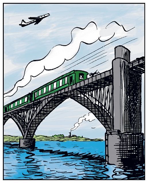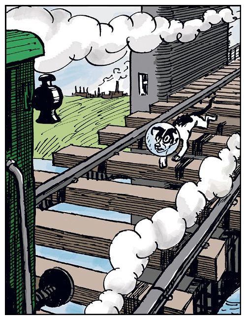 Поезд продолжал неспешно ползти по красивому мосту. В небе летел самолёт. По реке проплывали лодки и кораблики. На противоположном берегу раскинулись поля, а за ними какой-то маленький завод. Из заводской трубы клубами поднимался пар, точь-в-точь как из трубы паровоза, который всё дальше и дальше убегал от Мика.
