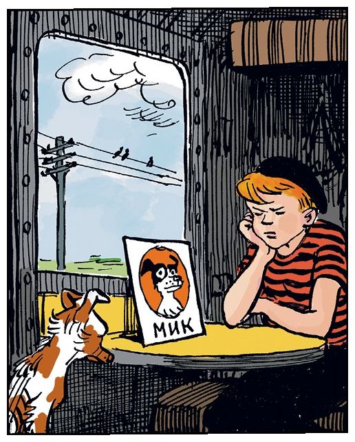 Удручённые горем Петя и Мук вернулись в своё купе. Петя достал из рюкзака фотографию Мика, поставил её на стол и сокрушённо подумал: «Наш замечательный друг, бедный Мик! Наверное, мы уже никогда с тобой не увидимся». Петя сидел со слезами на глазах и посматривал на портрет друга.