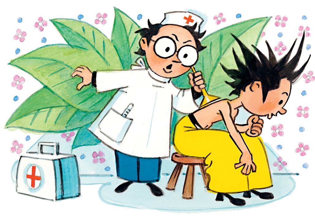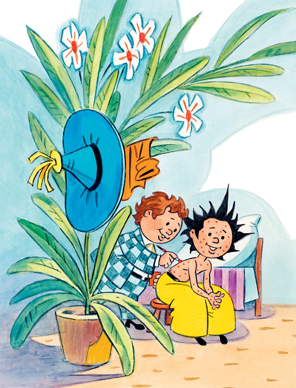 – Всё, братец, может случиться. Ну, например, начнёшь ты красными прыщиками покрываться. Значит, ветрянка. Но ничего страшного: мы их зелёнкой будем мазать. Правда, болезнь эта недели три продлится.