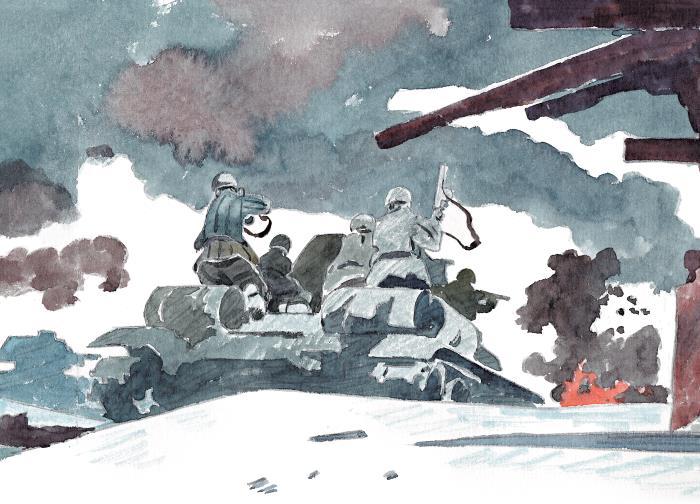 Но вдалеке раздался рокот моторов. Толя залёг в сугроб и дождался колонну: совершенно новые штурмовые орудия, танки и грузовики с солдатами проползли в сторону моста через реку. Там колонна остановилась, и группа сапёров стала проверять – нет ли мин.