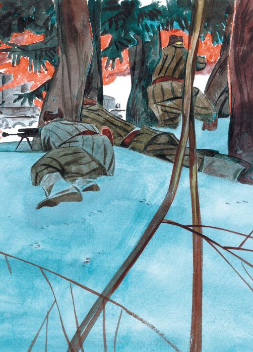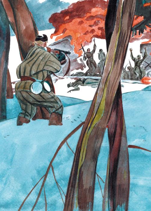 Через месяц по глубокому снегу, скрипящему на морозе, Володя с группой товарищей возвращается к месту первых боёв. Они долго сидят в засаде у лесной дороги, и вот появляется бензовоз и пара грузовиков с солдатами.