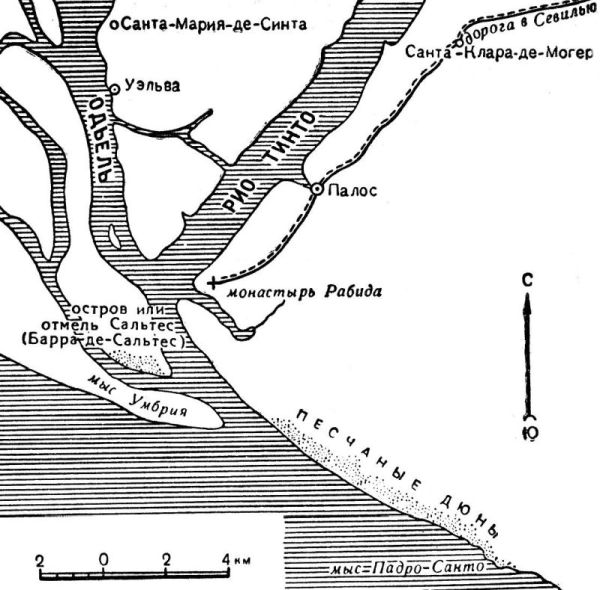 Наверное, Колумб выбрал короткий путь, хотя историки посылают его дальней стороной через Севилью. Так или иначе, жарким летом 1485 года Христофор очутился у стен монастыря Рабида, расположенного неподалеку от слияния Одьеля и Рио-Тинто у слепой затоки. Попасть сюда можно только морем или по севильской дороге через Палос. Вероятно, корабль Колумба шел по Рио-Тинто в Палос, а ему нужно было подняться несколько километров по Одьелю в Уэльву. Взгляните на карту и вам все станет ясно[15].