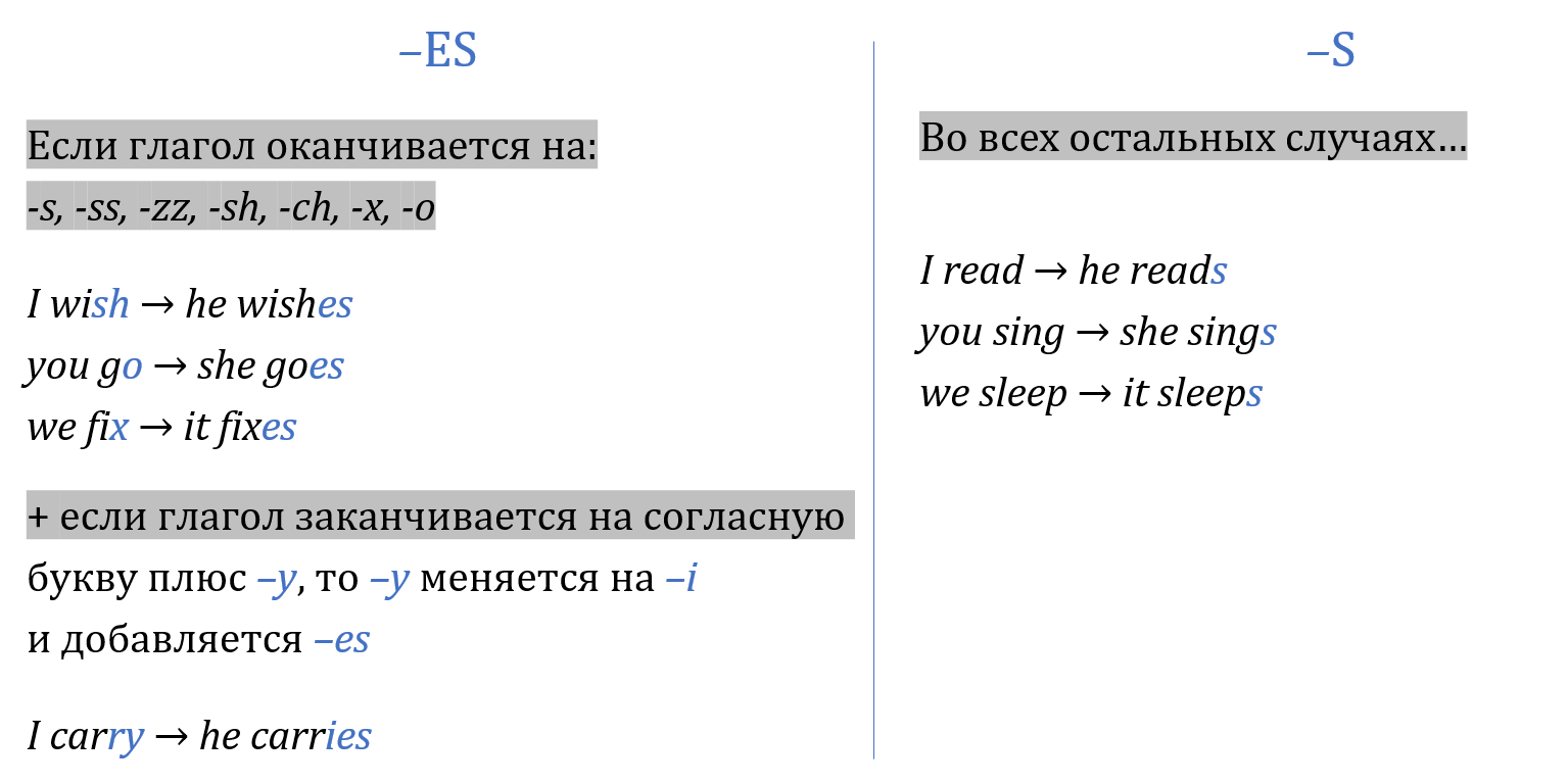 Для местоимений he, she, it (т. е. для третьего лица единственного числа) в настоящем времени (!) глаголы меняют свое окончание — добавляется –s или –es