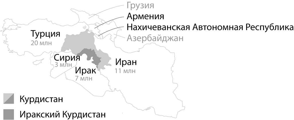 Курды долгое время существовали в составе Османской империи, а сразу после окончания Первой мировой войны была предпринята попытка образования независимого государства на севере Курдистана. Но Турция, даже ослабленная военным поражением и потерявшая контроль над территорией когда-то могущественной империи, нашла в себе силы противостоять этой инициативе через политический процесс. Позже на принадлежащих Турции и Ирану территориях были провозглашены курдские республики, которые не смогли просуществовать долго. Сепаратистские настроения подавлялись этническими чистками, уничтожением курдских деревень и массовым переселением. Кроме этого, была начата кампания по ассимиляции курдов[59]. Их язык и культура попали под запрет, который просуществовал до недавнего времени. Как результат этой кампании, около трети курдов в Турции не говорят на курдском языке. С 1984 года до настоящего времени между правительством Турции и группами Рабочей партии Курдистана[60] не утихает вооружённый конфликт. Турция также преследует курдские формирования на территории Иракского Курдистана и в Сирии.