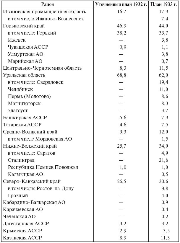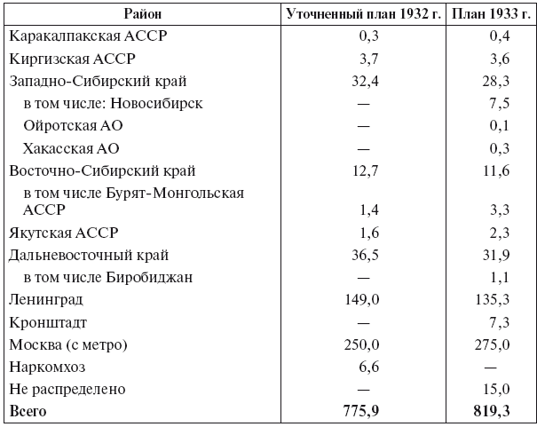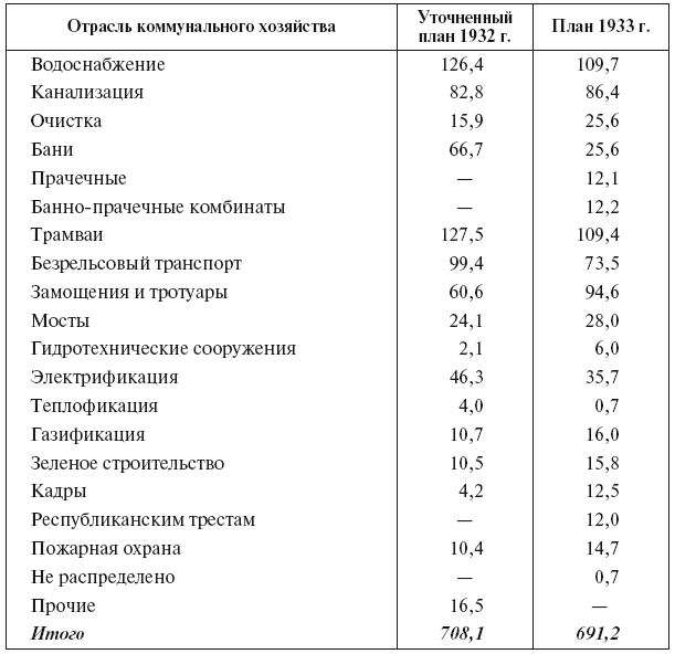 В целом по СССР в 1932 г. основную массу капиталовложений в жилищное и коммунальное строительство предполагалось направить в важнейшие промышленные центры и новостройки (80 % средств по жилищному строительству и столько же по коммунальному, без учета Москвы и Московской области). Задачей года стало завершение в первую очередь переходящего строительства и начало нового только при условии его материального обеспечения. В этих целях, помимо мобилизации внутренних ресурсов, внедрения хозрасчета и снижения себестоимости строительства, намечалось «всемерное привлечение» к участию в жилищно-коммунальном строительстве «широких масс трудящихся»[144].