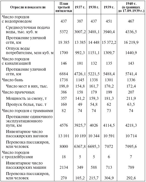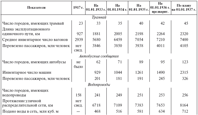 Крайне слабо использовались мощности как большинства старых, так и вновь построенных коммунальных предприятий. Например, коэффициент использования трамвая составлял: в Астрахани в 1934 г. – 70,9 %, а в 1935 г. – 73,8 %, в Перми – соответственно 65,7 и 77,1 %, в Куйбышеве – 60,2 и 64,2 % и т. д. Из 60 обследованных городов в пяти находилось в движении около 50 % вагонов, а остальные были в ремонте или ожидали недостающих частей и оборудования. Коэффициент использования автобусного парка в целом по городам РСФСР составил за 1934 г. всего 64 %, а без учета Москвы и Ленинграда снизился до 47 %. В некоторых городах использование автопарков было чрезвычайно низким: в Иванове – 29 %, Ярославле и Ижевске – 25 %. Не лучше обстояло дело с пропускной способностью бань и прачечных. За 1934 г. она составила в Татарской АССР – 52 %, в Воронежской области – 49 % и т. п. Недостаточно развивалась сеть электростанций, плохо обстояло дело с присоединением домовладений к водопроводным и канализационным магистралям[165].
