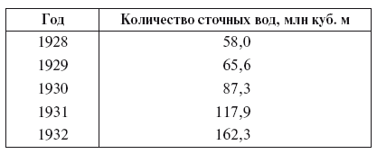 В 1932 г. в СССР было уже 52 канализованных города, из них 44 – в РСФСР. Кстати, в республике отмечались самые высокие темпы расширения географии канализации: в 1923 г. – 26 городов, в 1929 г. – 33, в 1930 г. – 37 и в 1931 г. – 40. Этот рост непосредственно отразился на увеличении объема сточных вод, особенно значимом в 1932 г. (табл. 2.2)[247].