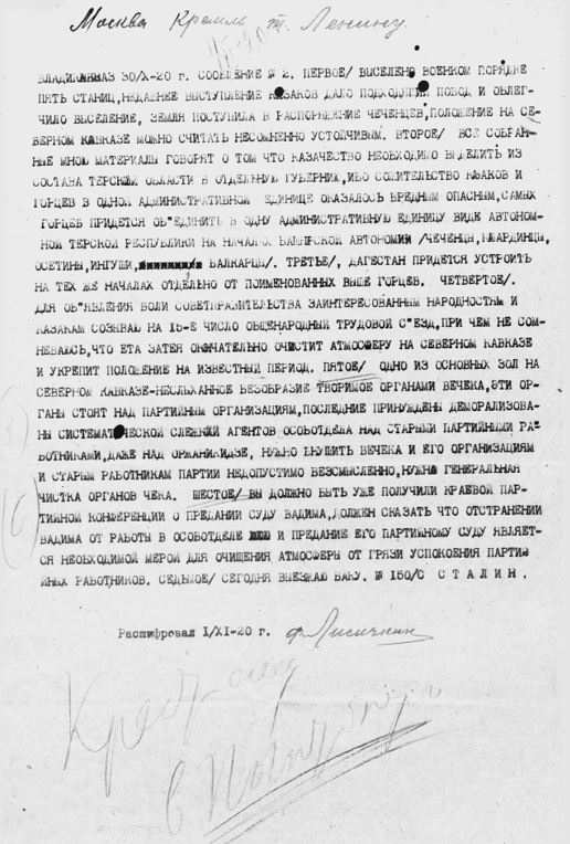 Телеграмма Сталина из Владикавказа Ленину в Москву о положении на Северном Кавказе, необходимости выделения казачества из состава Терской области и образования Терской и Дагестанской автономных республик, созыве съезда в связи с этим, необходимости чистки органов ВЧК в Закавказье, терроризировавших старых партийных работников, и решении краевой партконференции о предании суду руководителя Особого отдела местной ЧК.