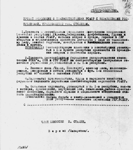 «Признать целесообразным формальное вступление независимых советских республик Украины, Белоруссии, Азербайджана, Грузии и Армении в состав РСФСР, оставив вопрос о Бухаре, Хорезме и ДВР открытым».