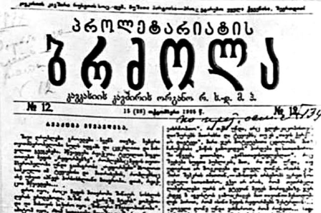 Подпись: «Статья И.В. Сталина "Реакция усиливается" из № 12 газеты Пролетариатис Брдзола" от 15 октября 1905 г.»
