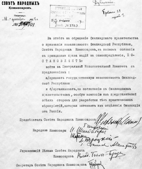 «В ответ на обращение финляндского правительства о признании независимости Финляндской Республики Совет народных комиссаров в полном согласии с принципами права наций на самоопределение ПОСТАНОВЛЯЕТ: