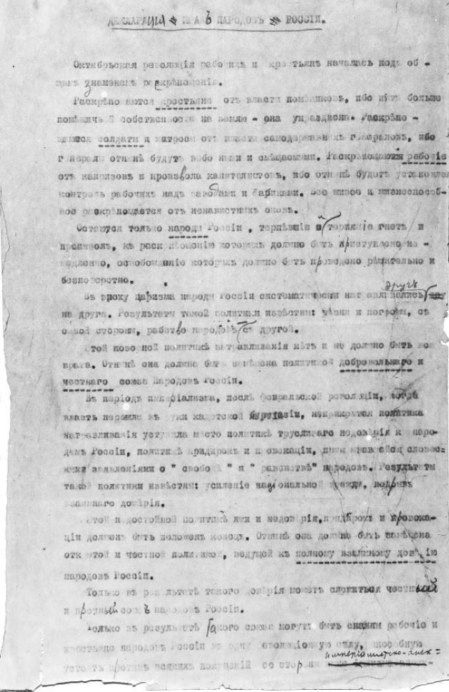 Декларация прав народов России – правовой акт, принятый СНК РСФСР 2 (15) ноября 1917 г. и излагавший основные принципы национальной политики Советского государства. РГАСПИ. Ф. 2. Оп. 1. Д. 5102. Л. 1‒3