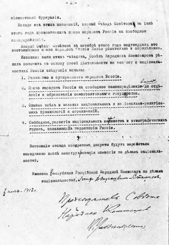 «Право народов России на свободное самоопределение, вплоть до отделения и образования самостоятельного государства». Подписи: Ленин. Сталин.
