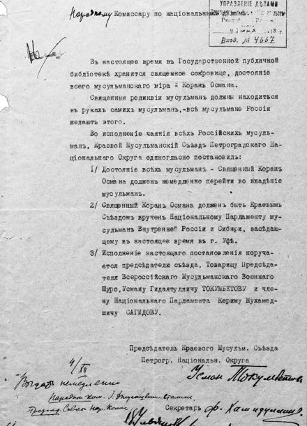 Письмо председателя Краевого мусульманского съезда Петроградского национального округа Усмана Токумбетова наркому по делам национальностей И. В. Сталину о передаче мусульманам Корана Османа. 4 (17) декабря 1917 г.