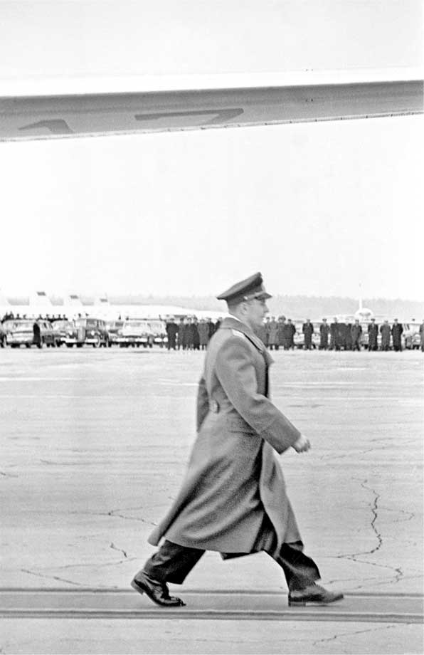 Ю. Гагарин направляется для доклада первому секретарю ЦК КПСС Н. С. Хрущеву о завершении полета. Внуковский аэродром. 14 апреля 1961 года