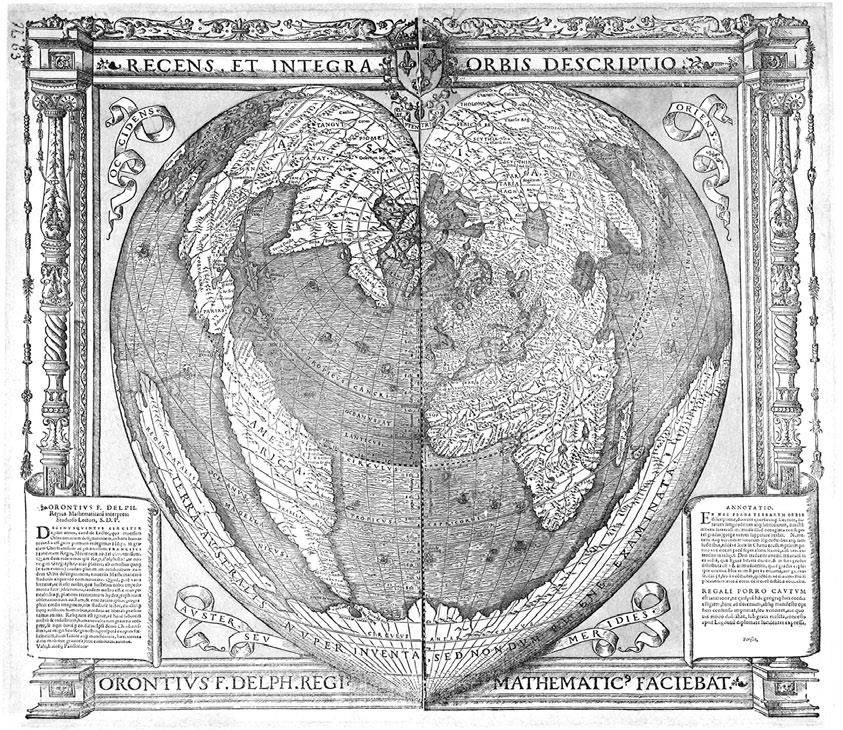 Знаменитая карта мира в форме сердца, составленная французским математиком Оронцием Финеусом в 1532 году
