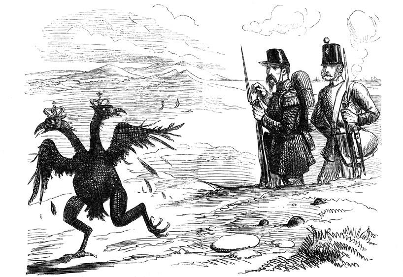 На одной из английских карикатур Российская империя изображена в виде двуглавого орла, убегающего от английского и французского солдат. А внизу подпись: «Двуглавая ворона в Крыму. Она получила жестокий удар! Добей ее». Данный «шедевр» был опубликован в английском журнале «Панч» (Punch) в 1855 году, когда Николай I начал войну с Османской империей, пытаясь защитить от произвола турок христиан из Валахии, Молдавии, Болгарии и Сербии.