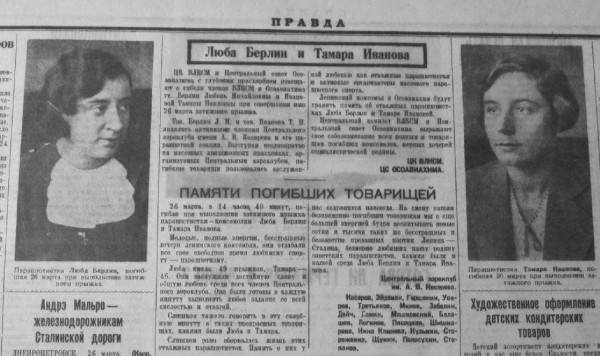 «ЦК ВЛКСМ и Центральный совет Осоавиахима с глубоким прискорбием извещают о гибели членов ВЛКСМ и Осоавиахима тт. Берлин Любовь Михайловны и Ивановой Тамары Павловны при совершении ими 26 марта затяжного прыжка.