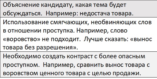 Пример серии прямых вопросов для кладовщика: «Кто-нибудь из неработающих на складе рассказывал Вам как можно воровать? Кто-либо из неработающих на складе предлагал вам участие в воровстве со склада? Кто-либо из работников склада рассказывал вам как можно воровать? Кто-либо из работников склада предлагал вам участвовать в хищениях? Вы сами рассказывали кому-то как можно воровать? Вы сами участвовали в хищениях на складе»?