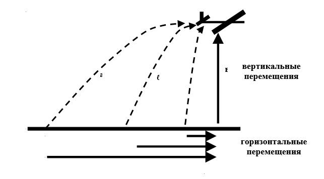 Произведем разложение движений пули вверх и вперед. Можно видеть, что время подъема пули одинаково. При этом за одинаковое время подъема три пули проходят три разных перемещения вперед. Горизонтальные же перемещения, изображенные на рис. , будут пропорциональны горизонтальным скоростям.