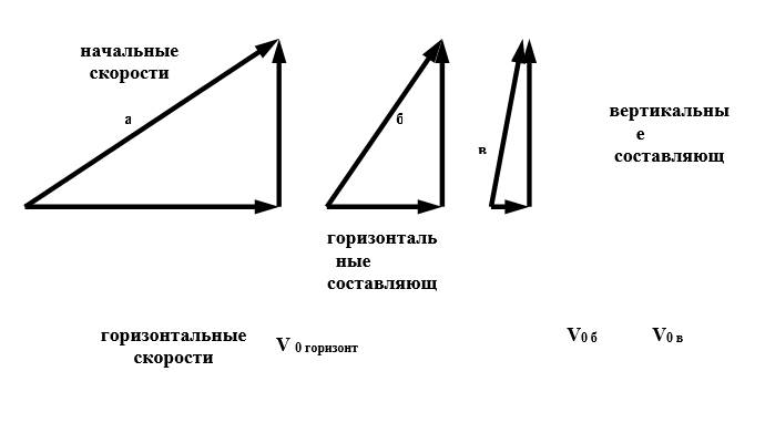 Рис. Схемы разложения векторов начальных скоростей на вертикальную и горизонтальную составляющие.