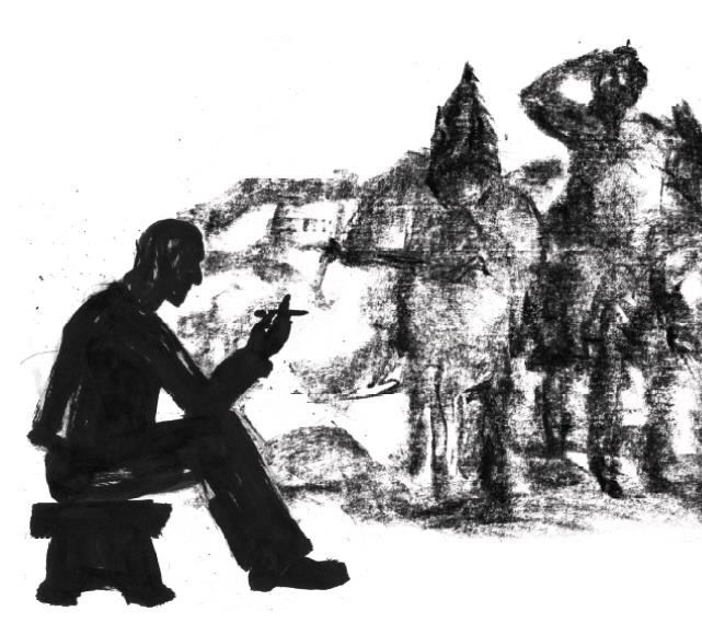 Смеркается, и мой дед приносит из сеней дрова, складывает поленья ступенчатой пирамидой в печи, открывает поддувало и разжигает новый огонь. Потом прикуривает от ярко вспыхнувшей щепочки и жадно вбирает в лёгкие дым. Сидя на маленькой самодельной скамеечке, он неспешно потягивает свою самокрутку, пока окурок не начинает жечь пальцы.