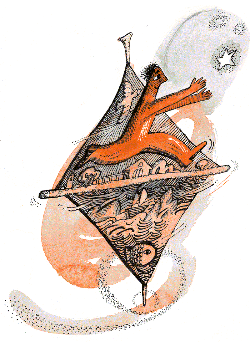 С точки зрения     дирижабля,Облака —     это волн силуэтыНа поверхности сонной моря,Под которой он сам —     субмарина.Длинных ливней     пресная капля,Тех, что в небо с земли воздеты,Капле моря соленого вторя,Ту иллюзию     сотворила.Ей согласно,     леса и горы,Что внизу проплывают чинно,Есть не более     чем кораллы,Населенные живностью донной —Существами смешными,     которымИмя ЛЮДИ дала пучина.Тралят дно это ливни,     как тралы,Упуская их тонну за тонной.Но зато,     поймав в самолеты —Очень странных конструкций ловушки, —Кто-то их,     на дне собирая,Вдруг из моря без всякой лескиПрямо к солнцу дергает с лету…И они,     прижавшись друг к дружке,Долго смотрят вниз,     замирая,На кораллов своих перелески…