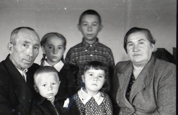 Наша семья – папа, Степан Андреевич, мама, Мария Дмитриевна и мы дети: я с отцом, рядом Таня, племянница, за нами стоят Лариса и Сергей. Заводоуспенка, 1955 год