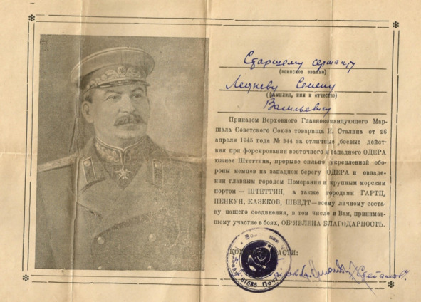 водой под огнём снайперов и прикованных к пулемётам смертников. На память об этом эпизоде войны остались хронические болезни, память о погибших друзьях. Капитан Красной Армии. Преподавал историю. Был директором вечерней и средней школы в Заводоуспенке, Свердловской области в 60-е годы, прошлого столетия.