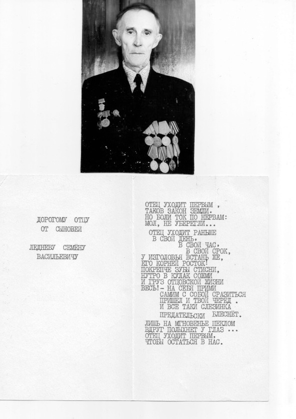 Для нашего вымирающего, бывшего рабочего посёлка Заводоуспенское, Тугулымского округа, Свердловской области, семья Леднёва Дмитрия Семёновича образец стойкости в невзгодах. Через него я получаю всю информацию о сегодняшней жизни посёлка, людей населяющих его. Это и есть связь поколений, необходимость которой мы и воспитываем в наших детях. Пока мы живы, наша память объединяет нас. едином и намерения в делах. Автор Сибиряк.