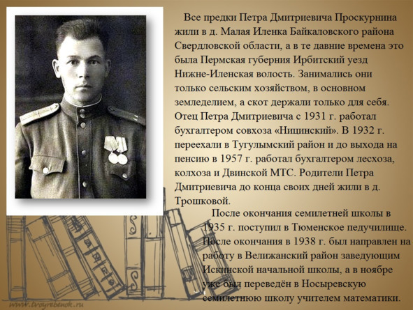 Материал мне любезно предоставил мой одноклассник, старший и единственный сын семьи Проскурниных, Владимир Петрович Проскурнин, проживающий в г. Сухой Лог, Свердловской области. До ухода на пенсию, он занимал пост зам. Мэра города по здравоохранению. Уважаемый как человек, житель города Сухой Лог, ветеран труда.