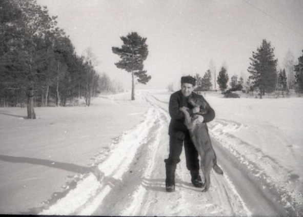 Старший и любимый брат Герман (1926—2004) с любимой всеми нами собачкой Диком по дороге на Торфоучасток. 1962 год.